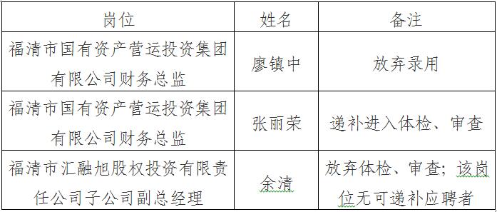 福清国企2021年中层及以上干部公开招聘因部分应聘者个人原因自行放弃,现将放弃名单、递补进入体检与审查名单公示如下,公示期3天。公示期间欢迎群众来电反映情况。公示电话:0591-87711219。