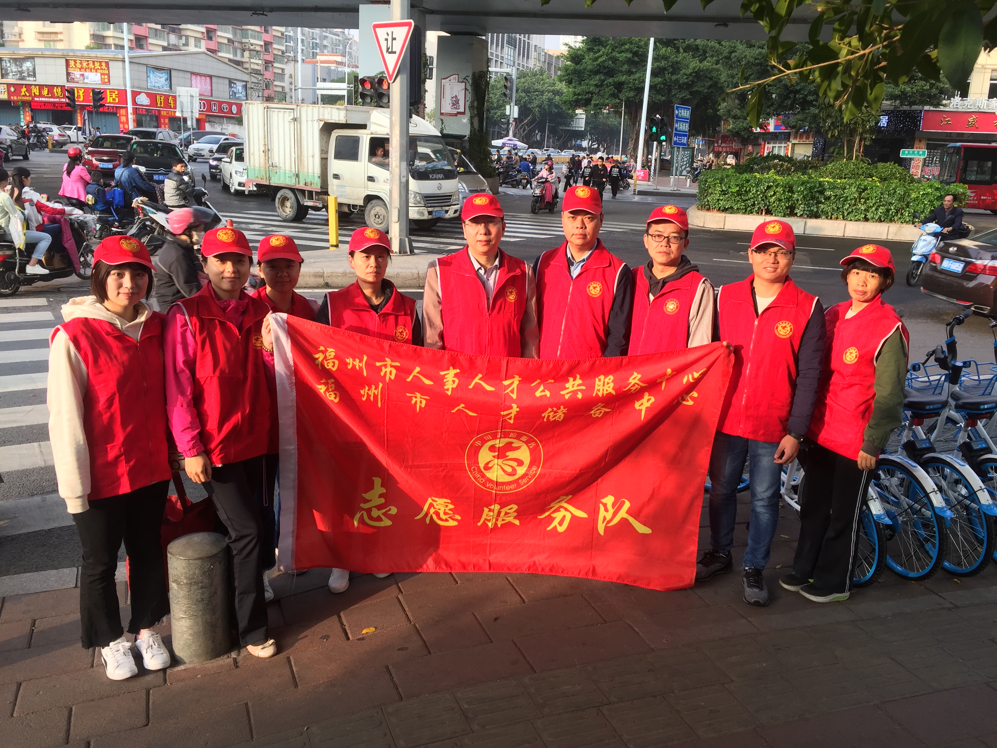 11月14日,福州市人事人才公共服务中心的志愿者们来到福新路东二环路口开展文明交通志愿活动,协助路面协管员维持交通秩序,劝导不文明行为。