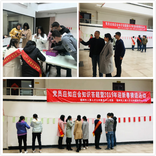 在2019年新春佳节来临之际,为让干部职工过一个喜庆、祥和、健康、文明的春节,营造“党的基本知识大学习”的浓厚氛围,中心党委与工会在福州市人事综合大楼一楼大厅联合举办党员应知应会知识答题暨2019年迎新春猜谜活动。