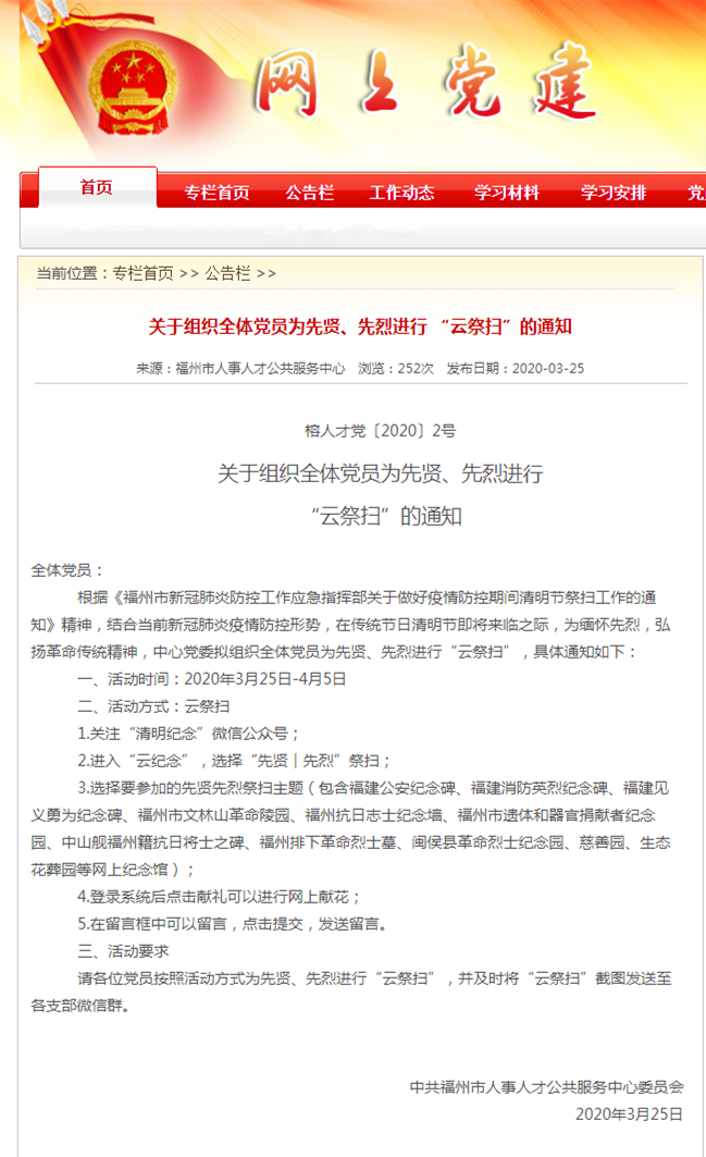 根据《福州市新冠肺炎防控工作应急指挥部关于做好疫情防控期间清明节祭扫工作的通知》精神,结合当前新冠肺炎疫情防控形势,在传统节日清明节即将来临之际,为缅怀先烈,弘扬革命传统精神,中心党委组织全体党员于3月25日至4月5日为先贤、先烈进行“云祭扫”。
