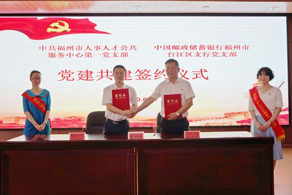 在中国共产党成立99周年来临之际,为充分发挥党建引领和党员的先锋模范作用,6月23日上午中共福州市人事人才公共服务中心党委第一党支部与中国邮政储蓄银行福州市台江区支行党支部在市人才储备中心举行党建共建签约仪式,双方以“创业伙伴”为主题,以平台共享为原则,以创业担保贷款业务的开展为重点,围绕促进就业创业工作,携手共建,实现业务、党建“双促进”。